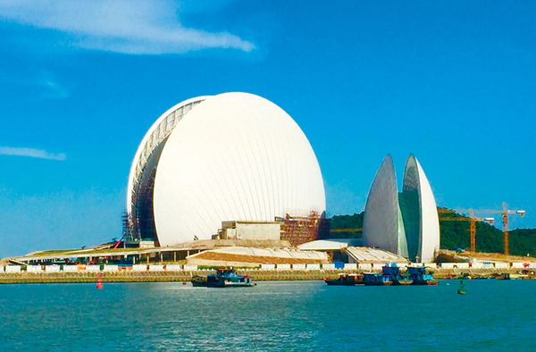 中國.一建設在海島上的歌劇院——珠海歌劇院2010年4月28日將動工建設,選址位于情侶路野貍島海濱,憑海臨風,選址.具.色。該項目規劃用地面積5萬平方米,總建筑面積約5萬平方米,投資估算約10.8億元.幣。2013年12月29日主體結構封.。